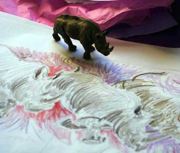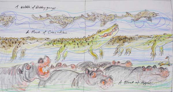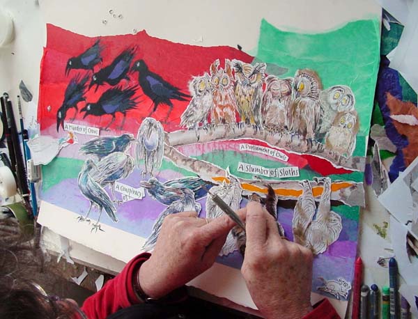 | The few images below are a glimpse of the process the illustrations went though. After designing the total layout of the book, and how the images would visually connect, I did further research and copious rough sketches of the sixty-odd different animals, most of which are particular species and sub-species. As things progressed I refined the composition of each page with the relevant text always an integral part of the overall page design. Each collage illustration took roughly 10 - 15 days to develop and execute, depending on the complexity of detail. | ||||